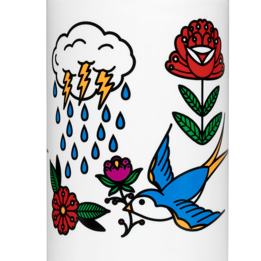 This flash sheet inspired bottle byJake Tongis a great match for our Sparrow Cages. Featuring birds, rain, and flowers, it captures the (soggy) beauty of spring.